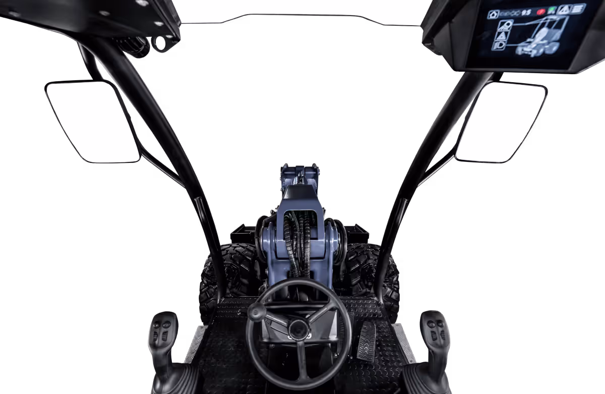 The inside turning radius is equal to compact articulated wheel loaders, but with wider square tire footprint stability